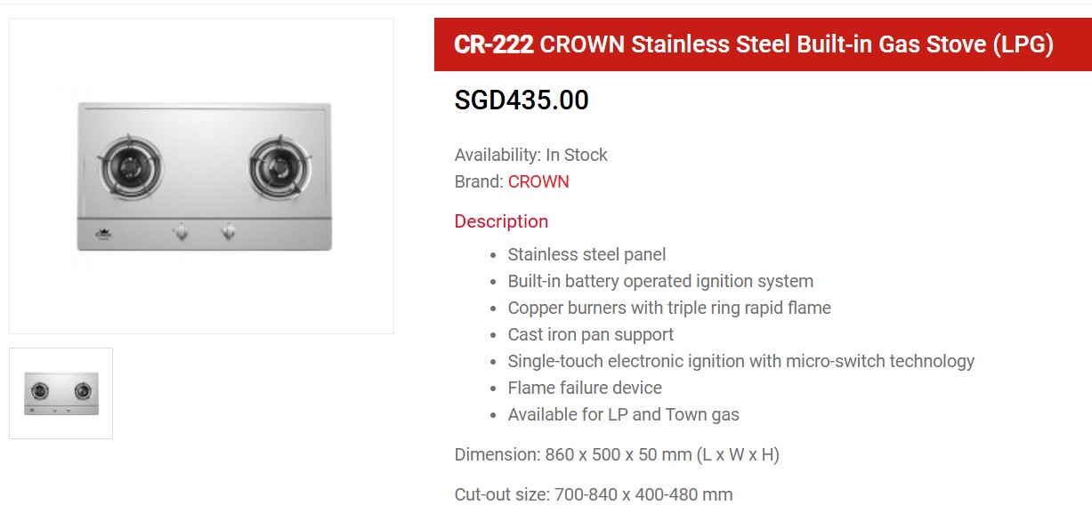 CR-222 CROWN Stainless Steel Built-in Gas Stove