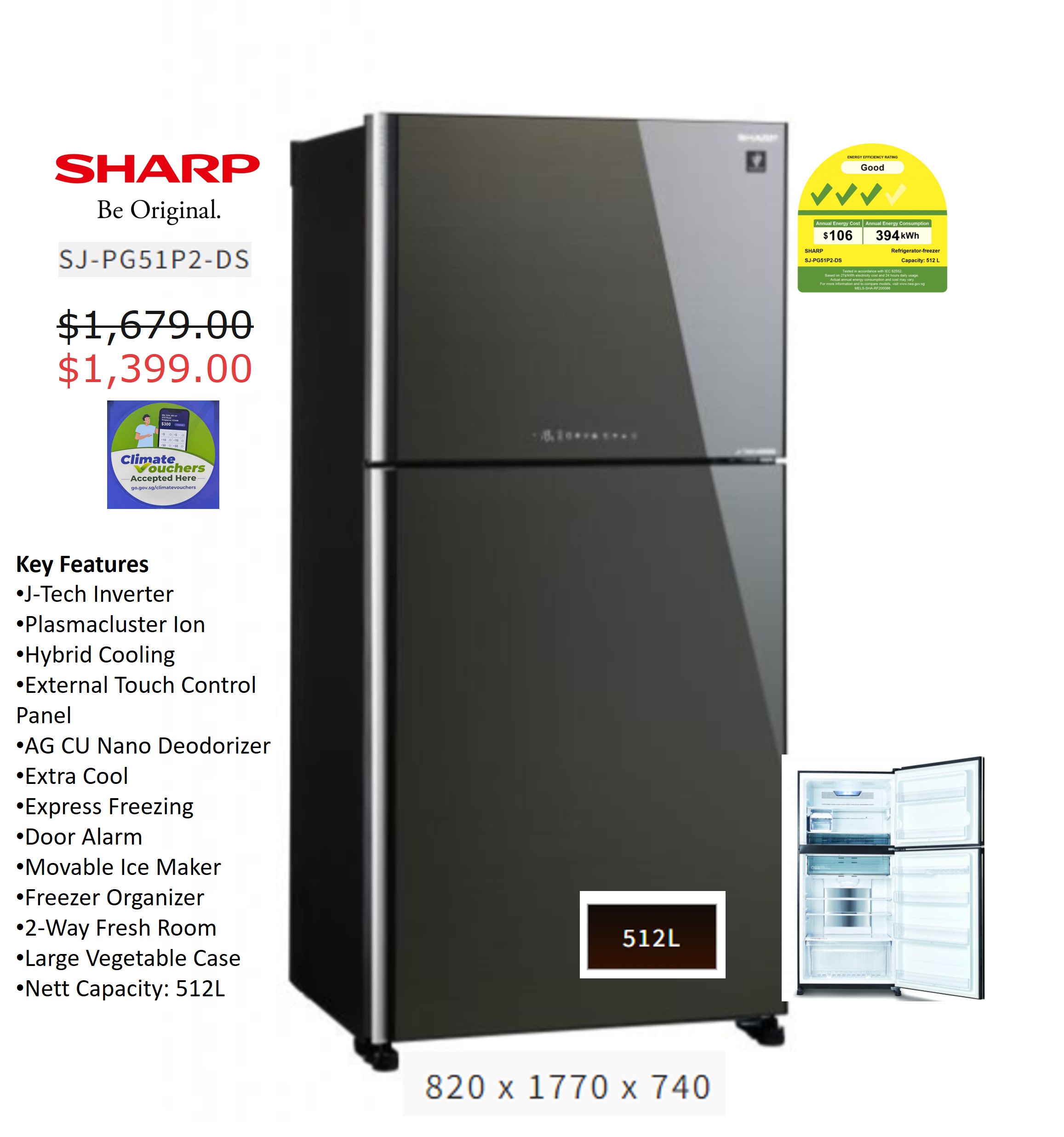 SHARP SJ-PG51P2-DS 2 DR FRIDGE (512L)
