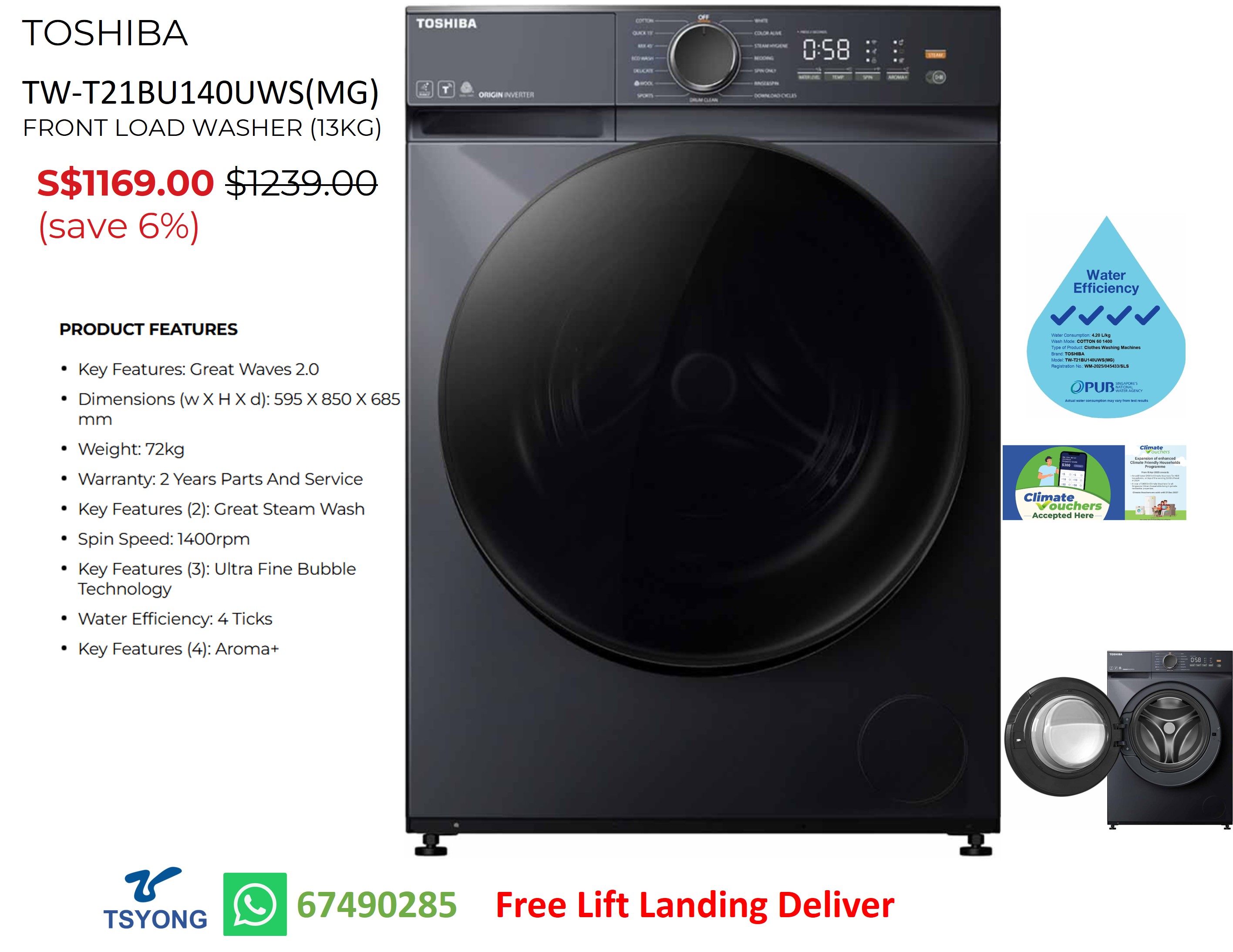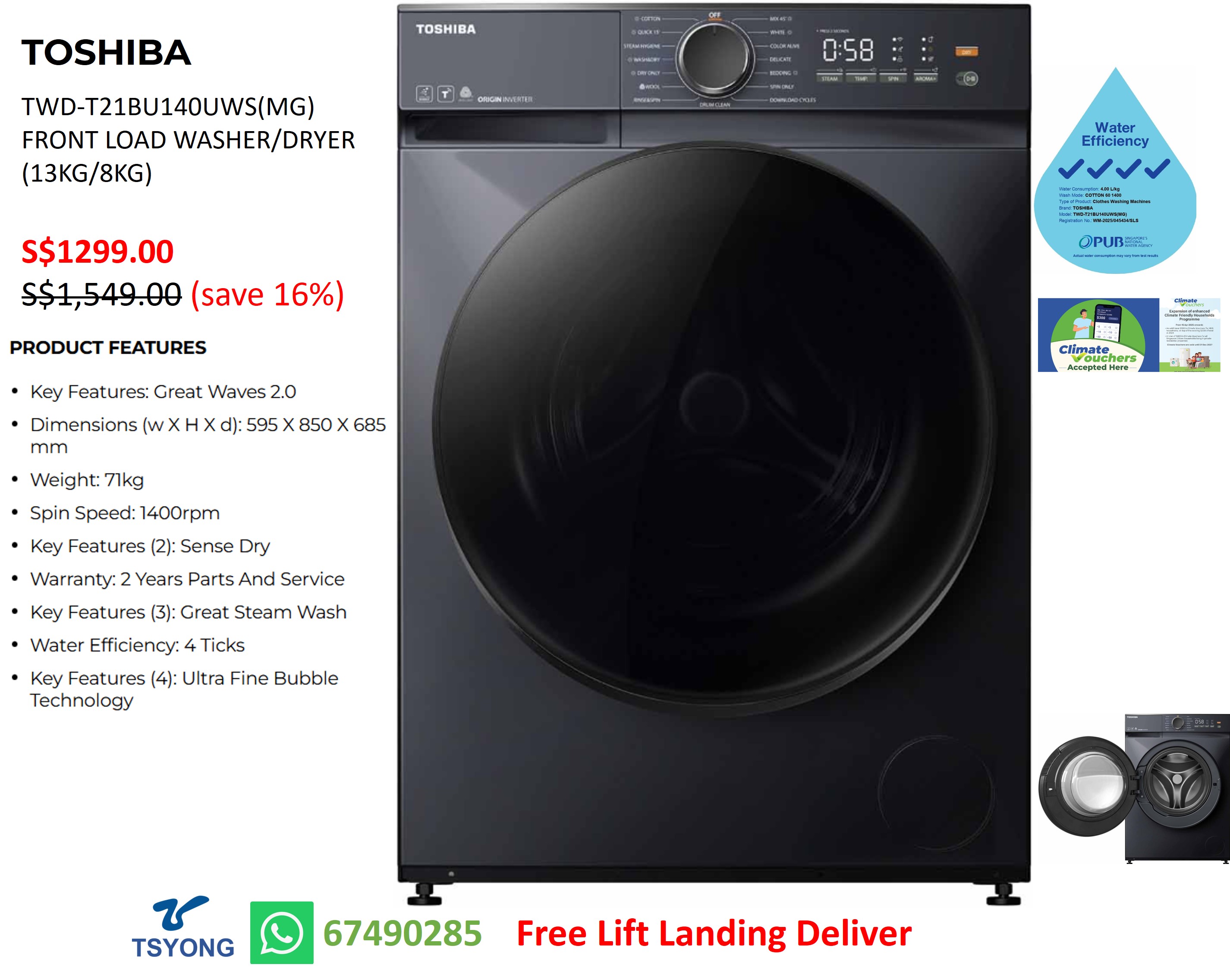 TOSHIBA TWD-T21BU140UWS(MG) FRONT LOAD WASHER/DRYER (13KG/8KG)