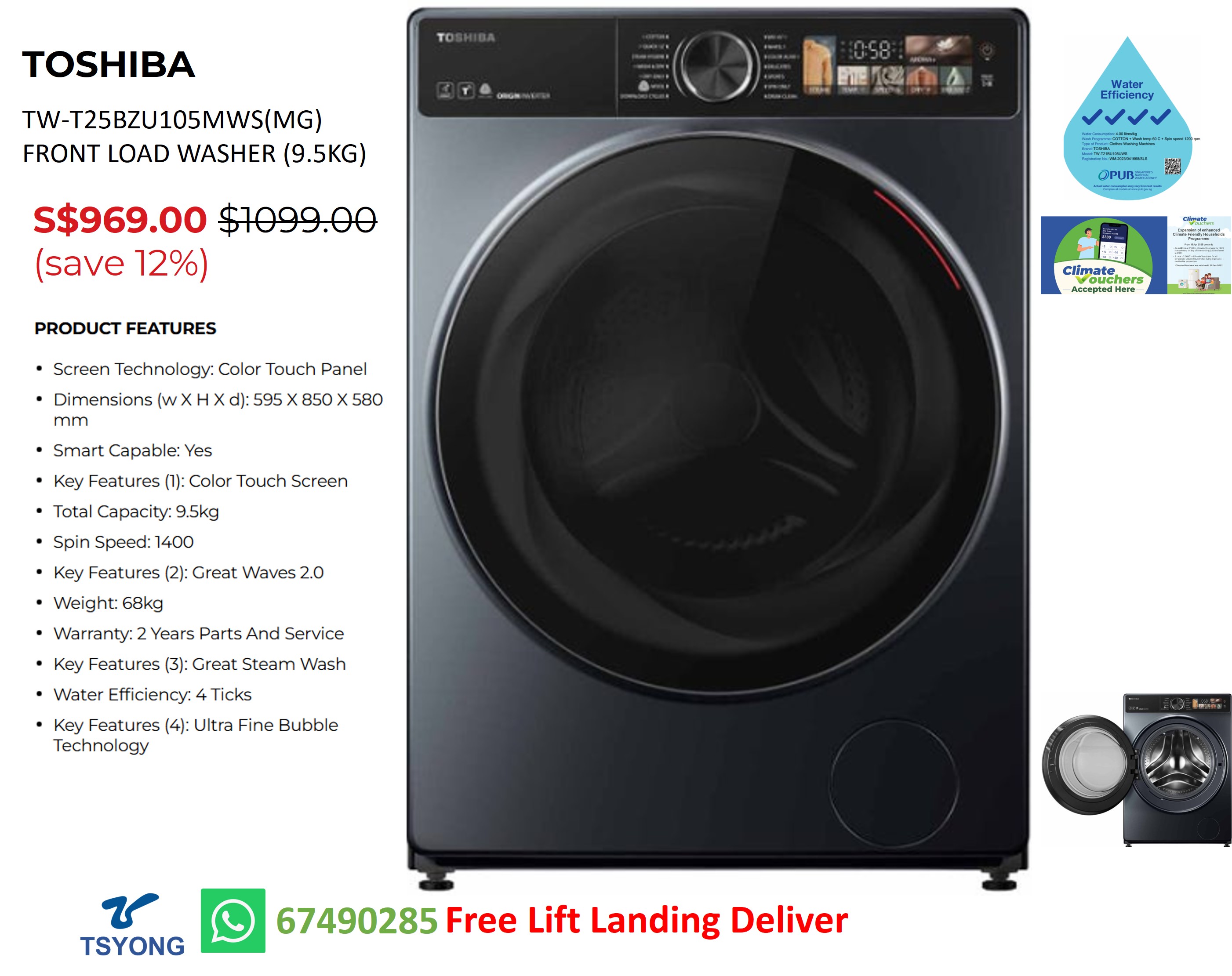 TOSHIBA TW-T25BZU105MWS(MG) FRONT LOAD WASHER (9.5KG)