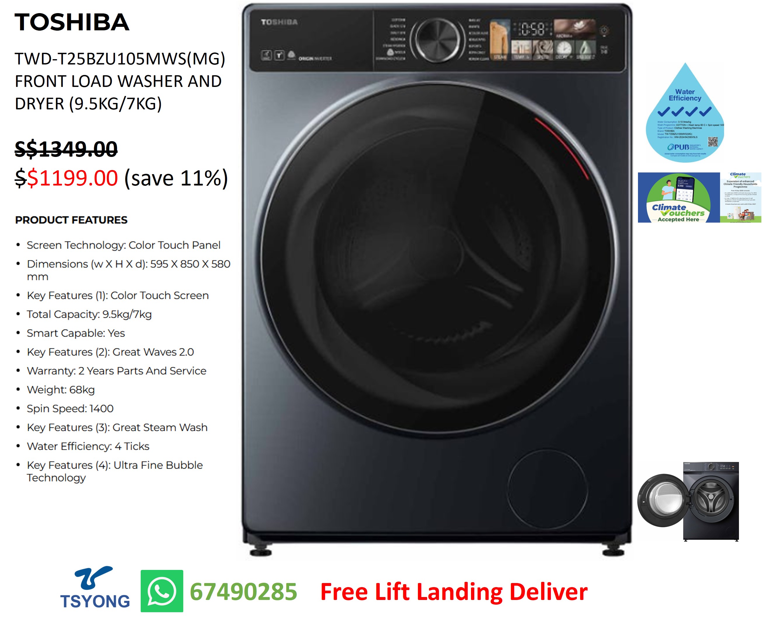 TOSHIBA TWD-T25BZU105MWS(MG) FRONT LOAD WASHER AND DRYER (9.5KG/7KG)