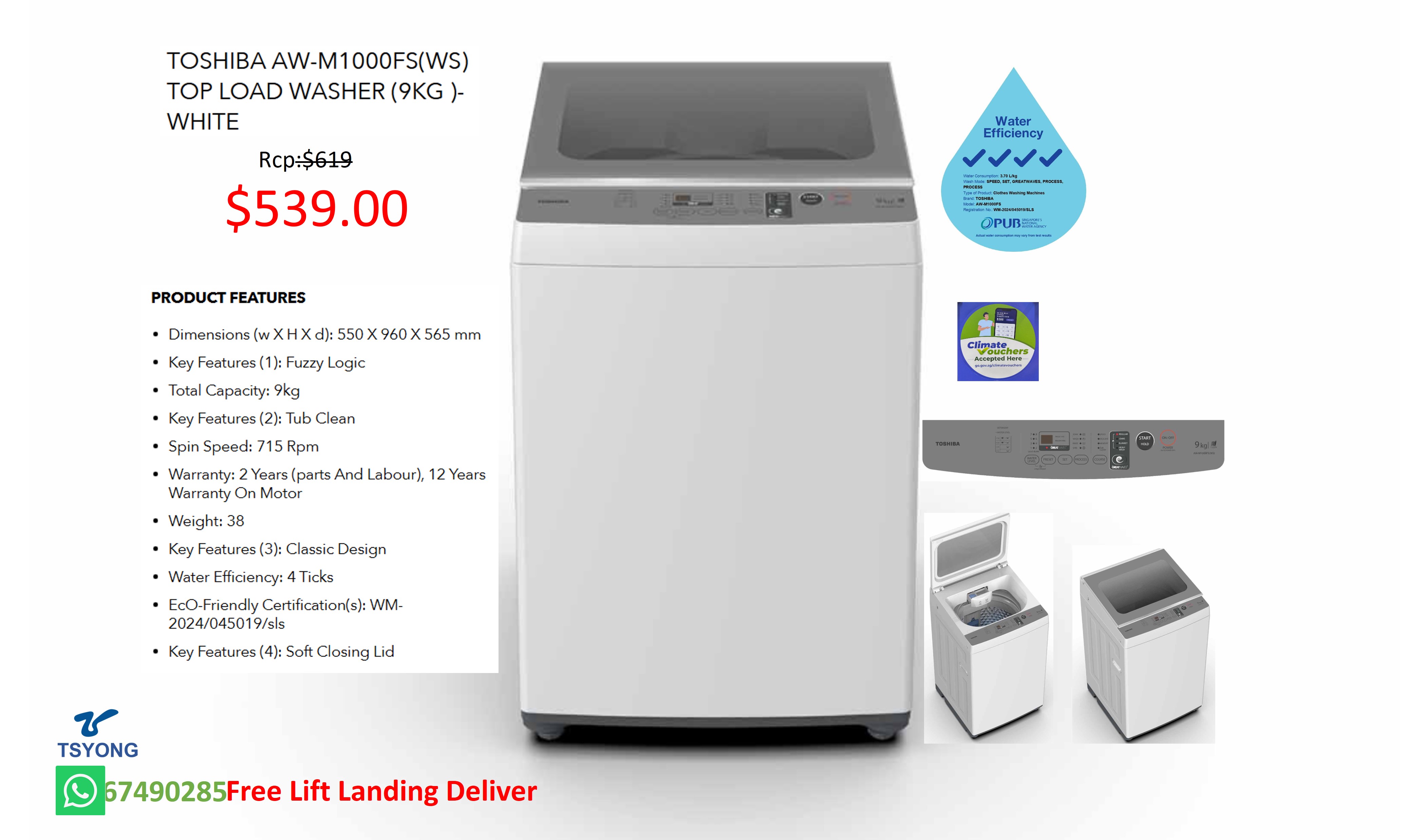 TOSHIBA AW-M1000FS(WS) TOP LOAD WASHER (9KG )-WHITE