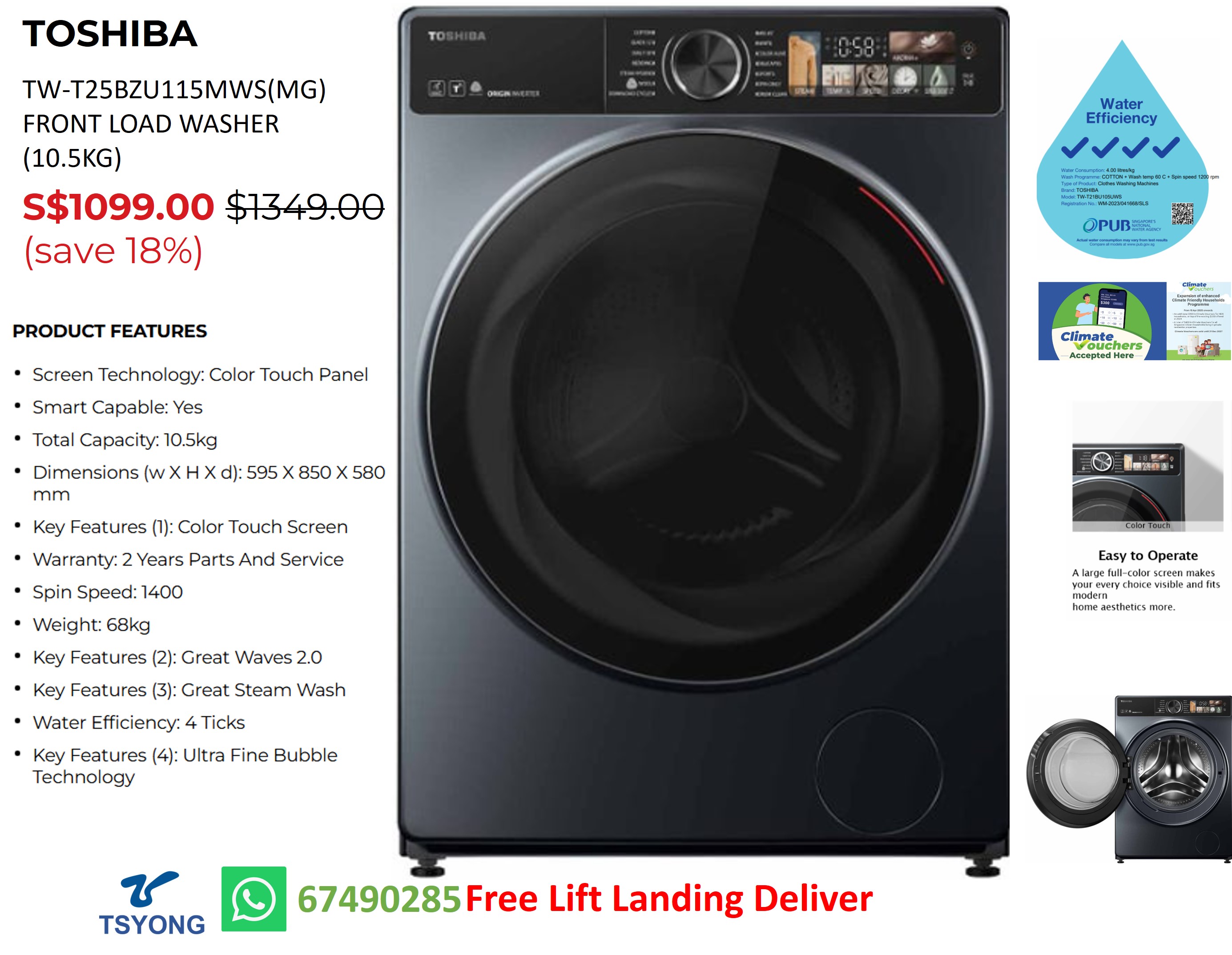 TOSHIBA TW-T25BZU115MWS(MG) FRONT LOAD WASHER (10.5KG)