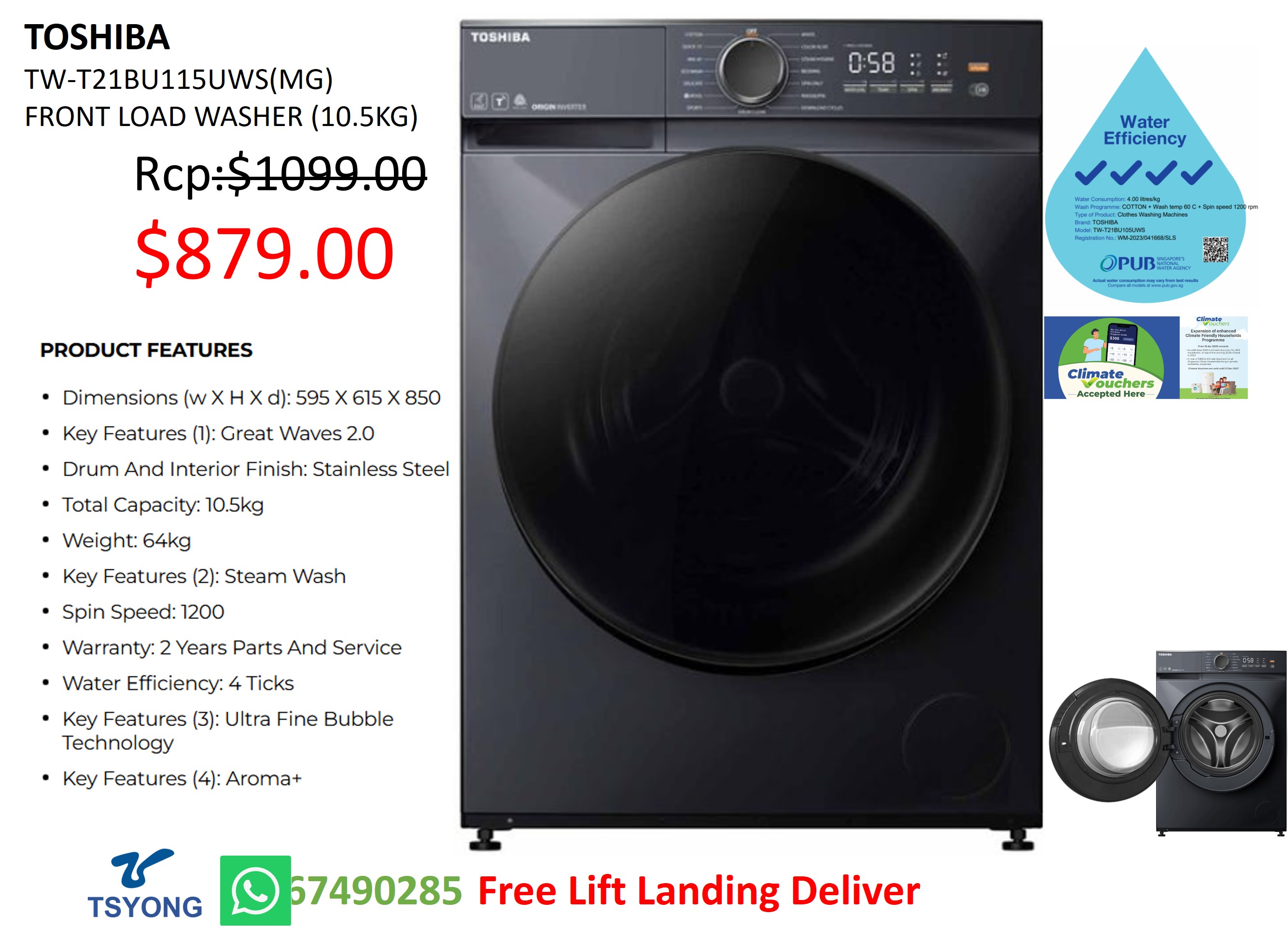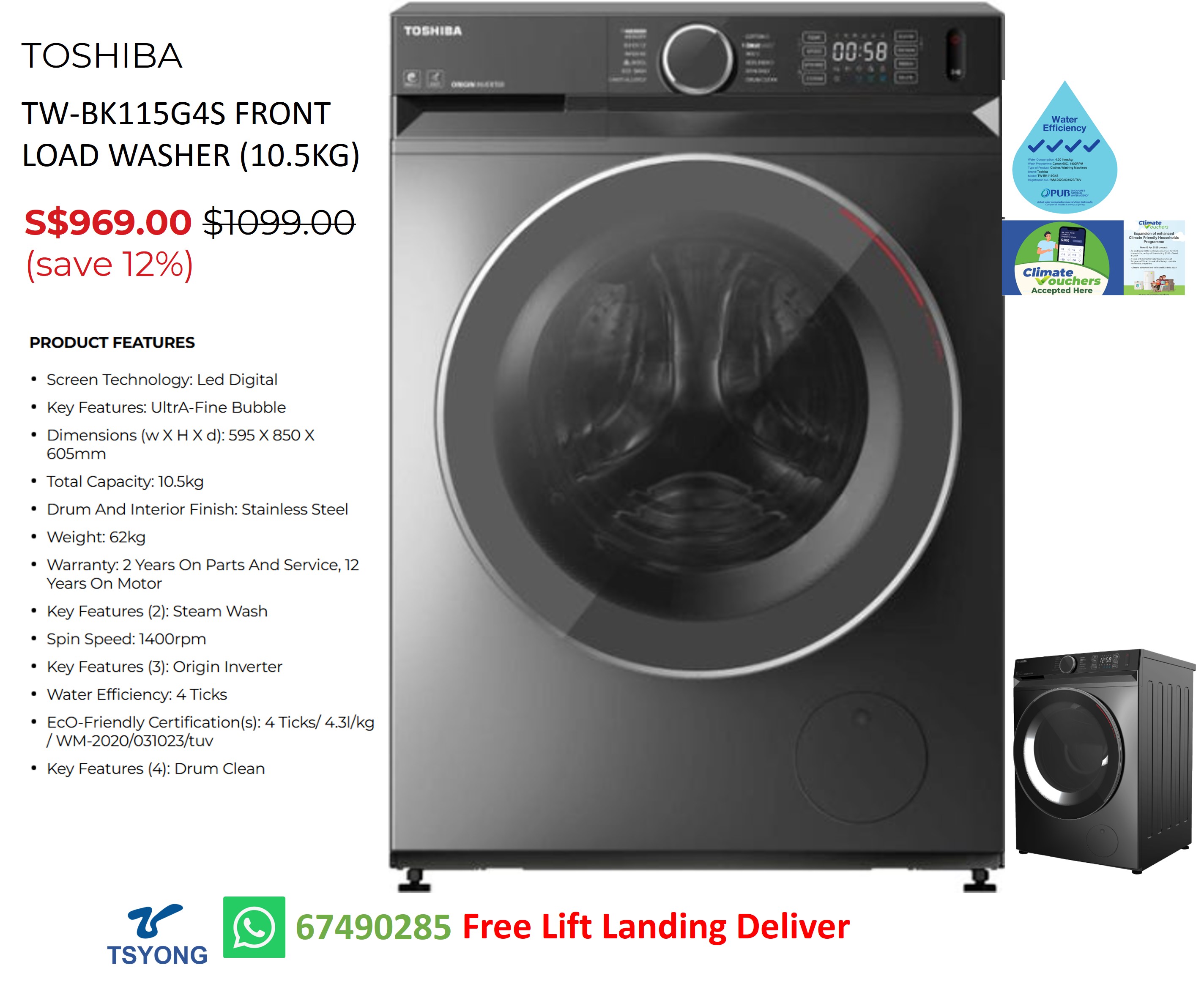 TOSHIBA TW-BK115G4S FRONT LOAD WASHER (10.5KG)