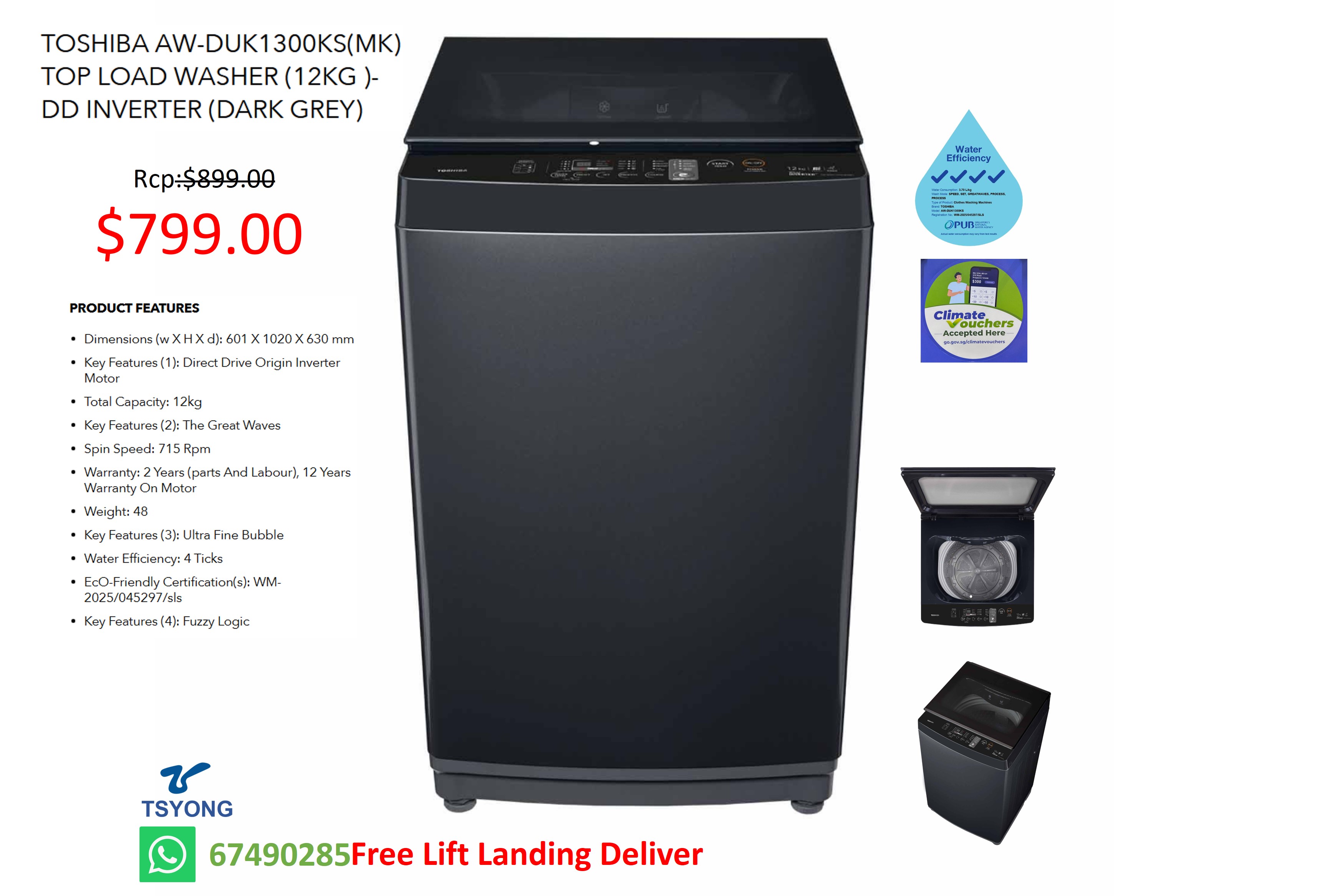 TOSHIBA AW-DUK1300KS(MK) 12KG 4TICKS TOP LOAD WASHER