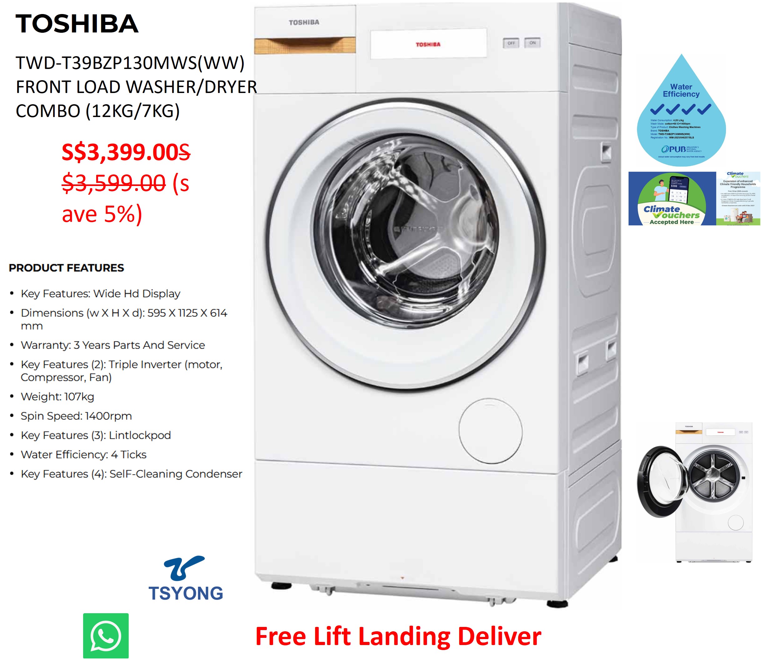 TOSHIBA TWD-T39BZP130MWS(WW) FRONT LOAD WASHER/DRYER COMBO (12KG/7KG)