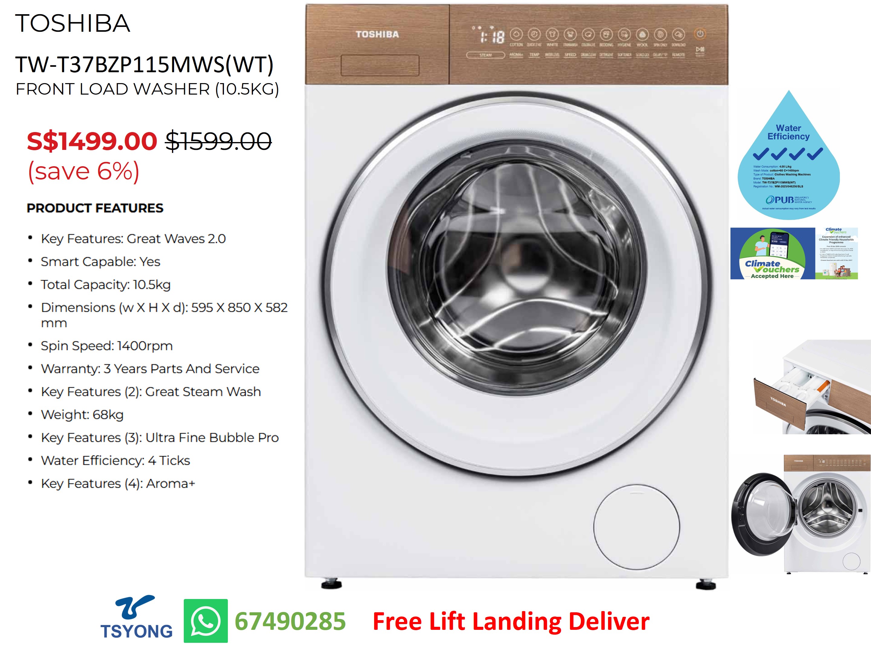 TOSHIBA TW-T37BZP115MWS(WT) FRONT LOAD WASHER (10.5KG)
